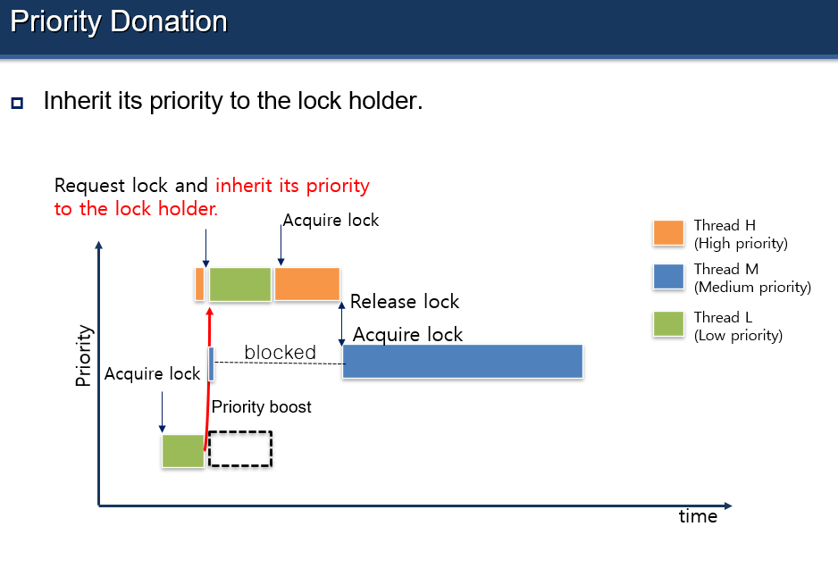 Priority Inversion 문제를 해결하기 위해, 낮은 우선순위 스레드가 lock을 보유했을 때, 높은 우선순위 스레드의 priority를 기부(donation)해야 합니다.